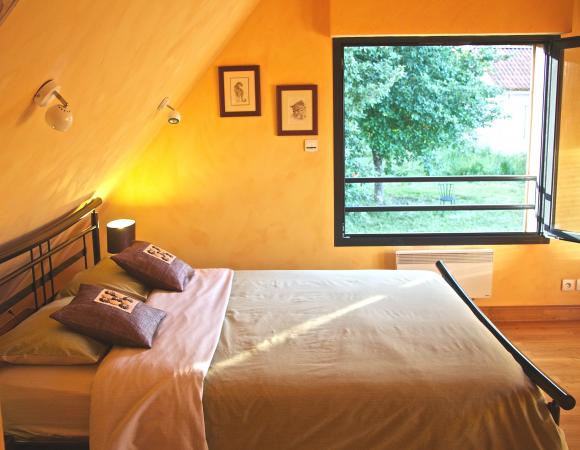 Chambre 3 personnes, 1 lit en 160 et 1 lit en 90cm, peut se louer pour 2 personnes. Salle de douche et wc privatif, salon cuisine (plaque électrique, réfrigérateur, poêle à bois, lecteur CD, radio...) en rez de chaussée que vous partagez avec l'autre chambre. Grande fenêtre de 1m2 vue sur la campagne, grand velux vue sur le vallon. Petits déjeuners bio compris.