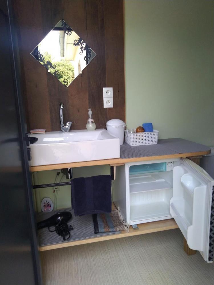 La chambre mobi-loft est aménagée dans un mobil home, un coin cuisine avec ustensiles, un lit 160x200 cm matelas grand confort avec TV, un wc indépendant, une salle d'eau cabine de douche double 140x90 avec fonction hammam (en option). Dans la salle de bain se trouve aussi l'accès au sauna traditionnel finlandais (en option - ce type de sauna peut facilement atteindre 80°). une terrasse privative
