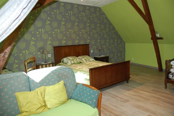 Chambre mansardée avec vue sur le jardin, décoration de charme avec un lit de deux personnes, ainsi qu'un lit une personne, bureau, meuble de rangement, TV couleur, salle de bain avec douche lavabo WC, linge de toilette et sèche cheveux. La chambre est également équipée de la WIFI.